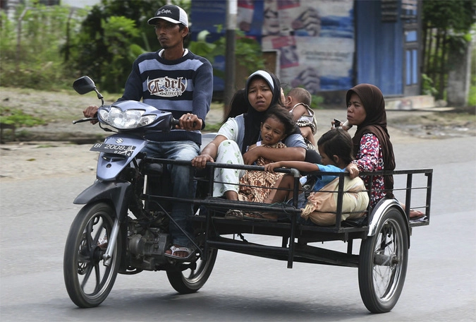 Мужчина эвакуирует свою семью на возвышенную местность в городе Банда-Ачех на острове Суматра. © Junaidi Hanafiah/Reuters