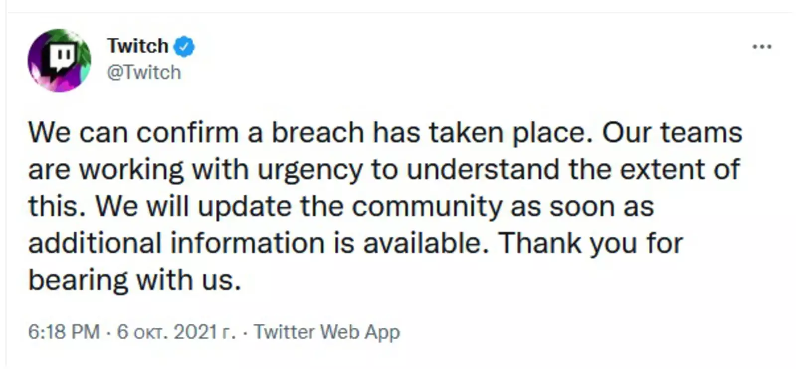 В своем публичном заявлении представитель Twitch подтвердил, что нарушение имело место: «Наши команды срочно работают, чтобы понять масштабы произошедшего. Мы сообщим сообществу, как только появится дополнительная информация».