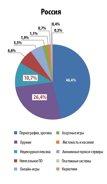 Россия отличается наиболее высокой посещаемостью сайтов с информацией об оружии и нецензурной лексике. Япония выделяется очень высокой долей порноресурсов (74,9 %), в США — большой процент посещения сайтов категории «Насилие» (7,0%), а Мексика первенствует в категории «Наркотики» (2,1%).