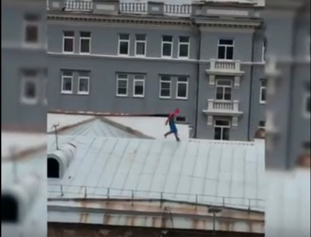 На кадрах видно, что мужчина в красно-синем костюме Спайдермена сидит на краю крыши. Затем он вскочил, пробежался по этой самой крыше, ловко перескочил на соседнюю, крутясь и пританцовывая, а затем снова присел и затаился.