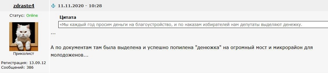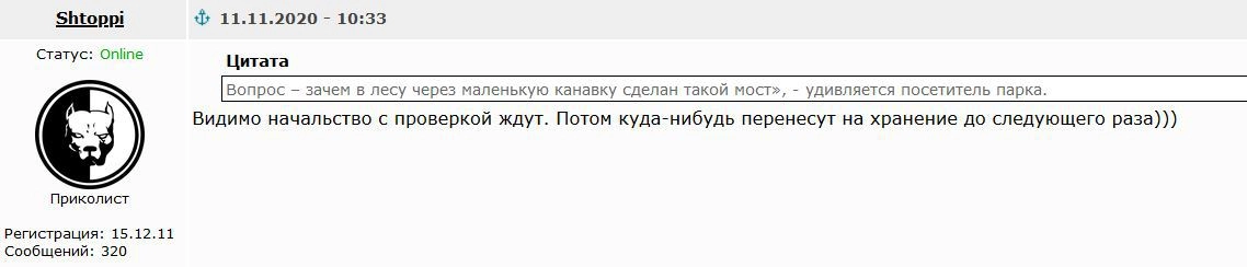 Директор парка Светлана Сердюк утверждает, что средства на строительство моста выделили депутаты. Об этом их попросили избиратели. Что же касается целесообразности моста через канаву в лесу, то, по ее словам, в ближайшее время там еще появится «уголок для влюблённых».