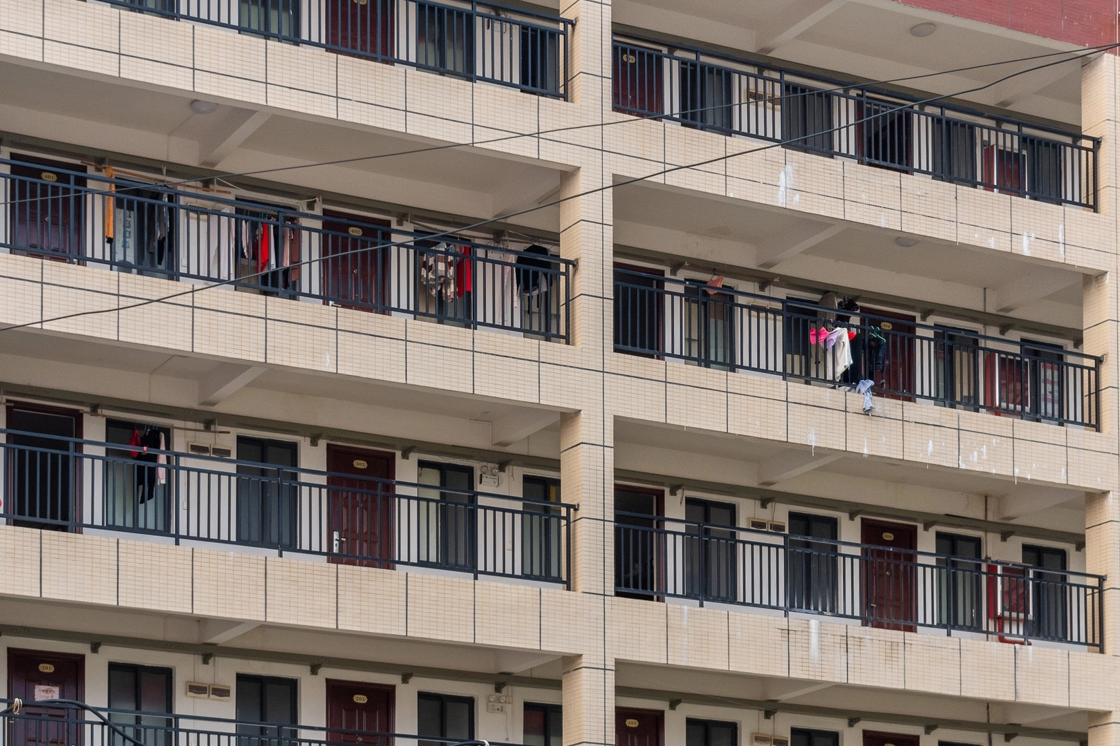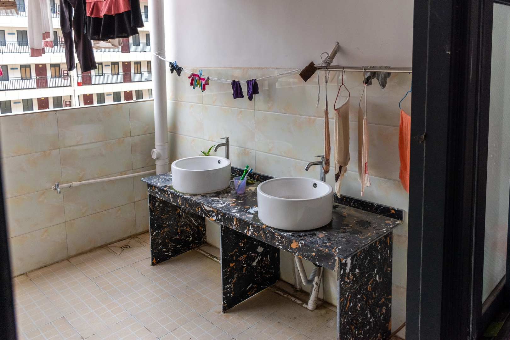 На балконе стоят раковины для умывания и сделаны веревки для сушки одежды. Южные регионы Китая отличаются высокой влажностью, и высушить белье можно только на улице.