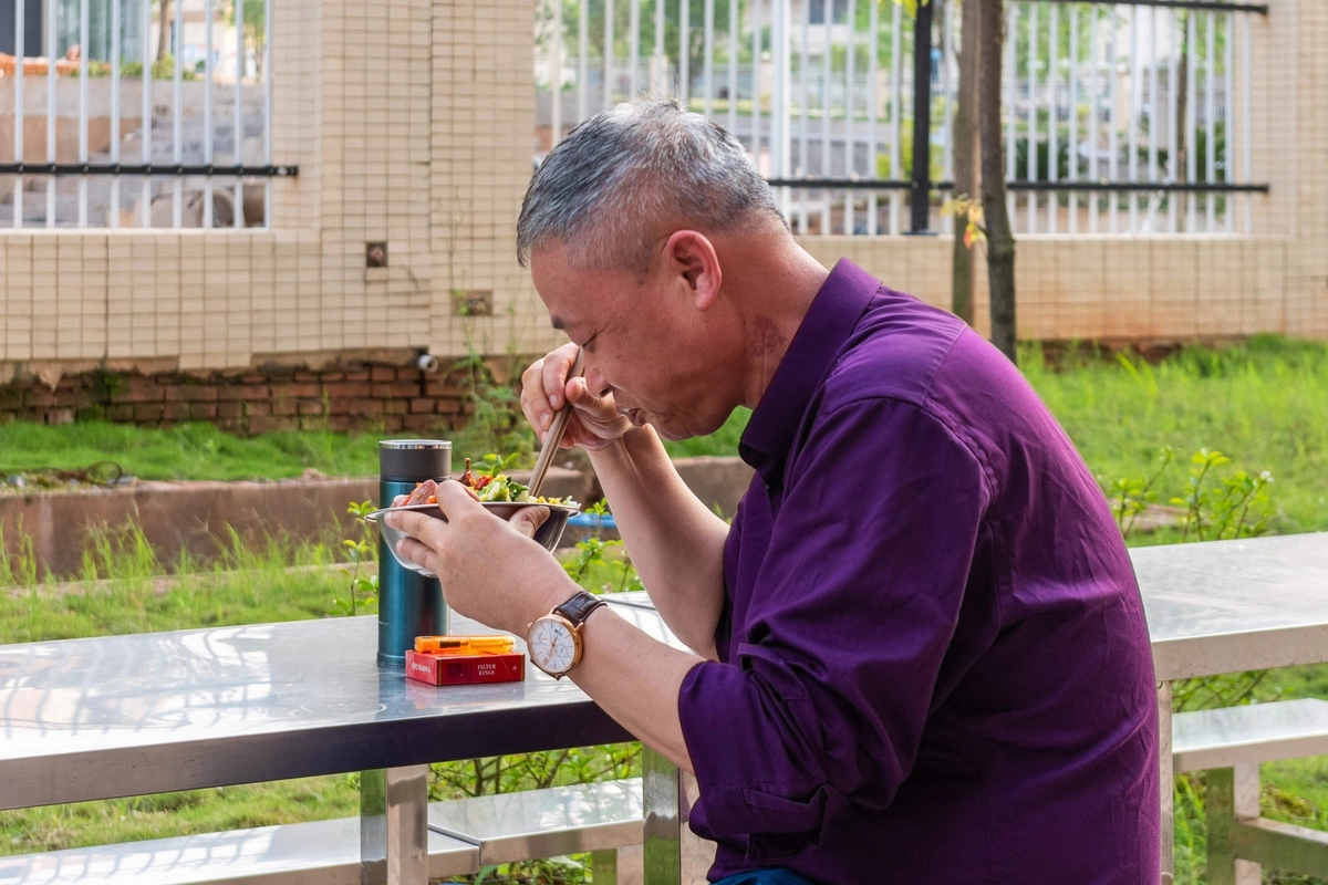 Рабочий потратил свободное время на перекус. Судя по содержимому его тарелки, в порциях никого не ограничивают.