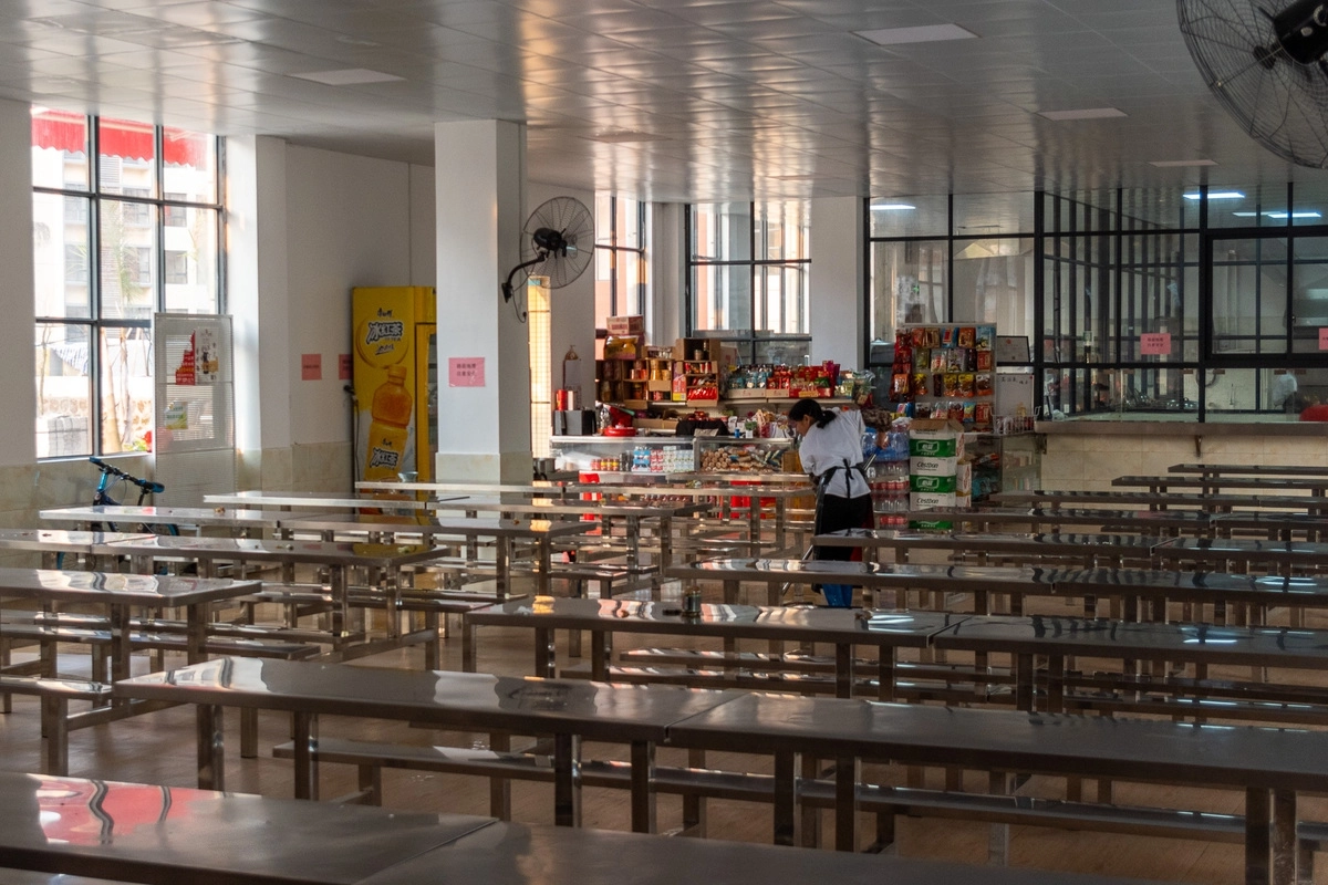 На первом этаже каждого блока находится кухня и столовая. Рабочих кормят три раза в день за счет компании. Предоставляется несколько блюд китайской кухни на выбор.