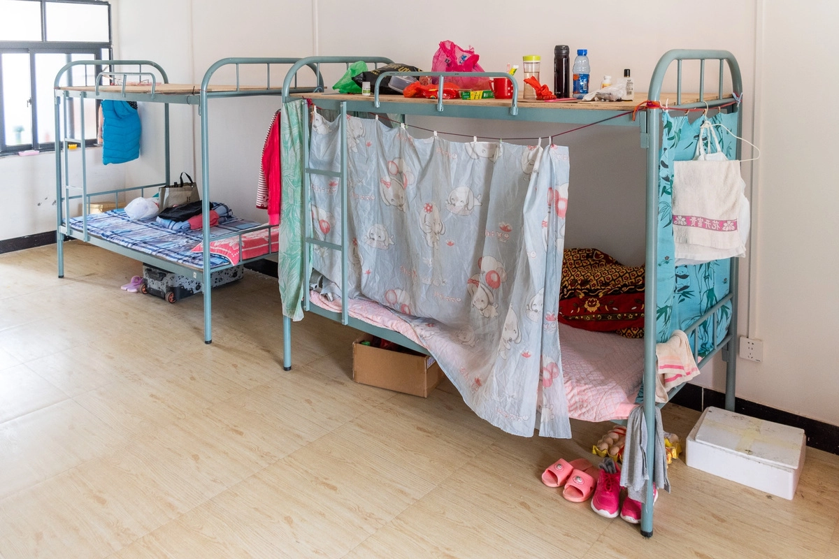 Сами комнаты выглядят просто и аскетично. Двухъярусные кровати, ванная комната, балкон и шкаф для личных вещей. На втором ярусе кроватей никто не спит, и хозяева используют его для хранения вещей.