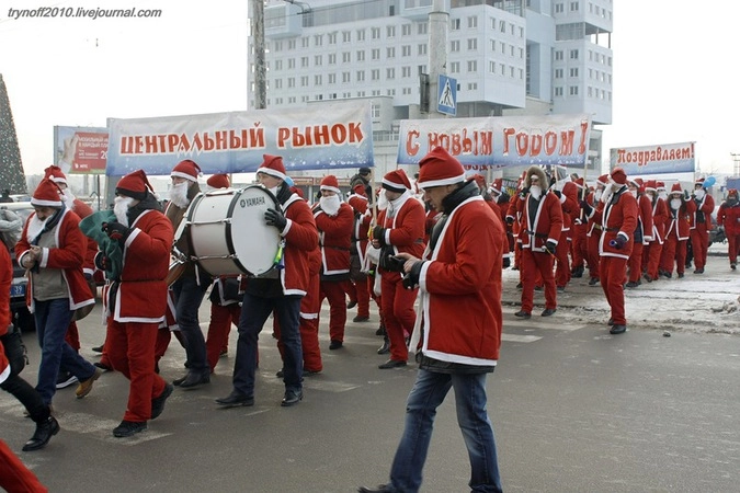 В 12.00 на площадке около Дома Советов собралась молодежь и люди старшего возраста. В какой-то момент все они, как по команде, достали красные костюмы, которые более походили на костюмы Санта-Клаусов, и превратились в большое количество похожих друг на друга символов нового года. Колонну Дедов морозов возглавлял глав-мороз с мегафоном, в который он то и дело выкрикивал заводящие толпу лозунги. Когда на импровизированной сцене у елки начали свое выступления артисты , колонна пестро одетых людей начала кружить хоровод, вовлекая в свое действо горожан, пришедших на новогоднюю ярмарку.