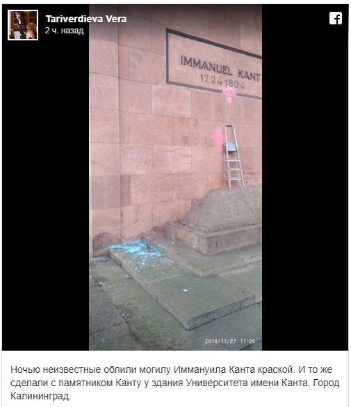 «Ночью неизвестные облили могилу Иммануила Канта краской», — написала она и опубликовала фото с места происшествия.