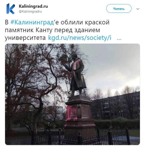 Ранее в Twitter появился снимок облитого краской памятника Канту, который находится у корпуса Балтийского федерального университета, носящего имя этого философа.
