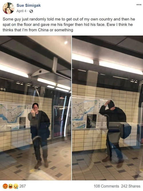 Опыт Дакоты Холмс не уникален. В начале апреля в Монреале женщина-инуитка Сью Симигак подверглась насилию со стороны незнакомого мужчины. Он также посоветовал ей «вернуться в Китай». Потерпевшая выложила в Facebook фотографии обидчика и его неприличных жестов.