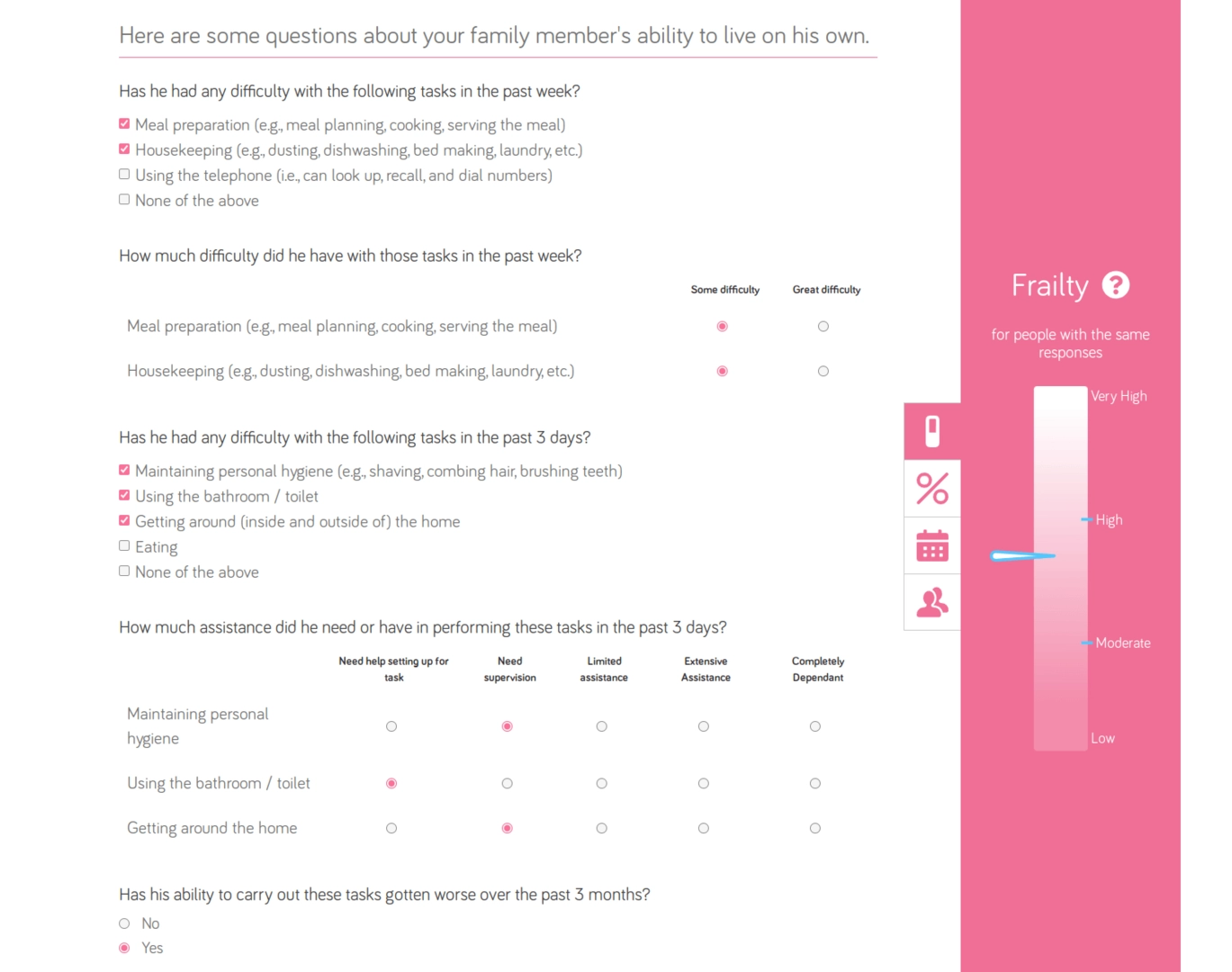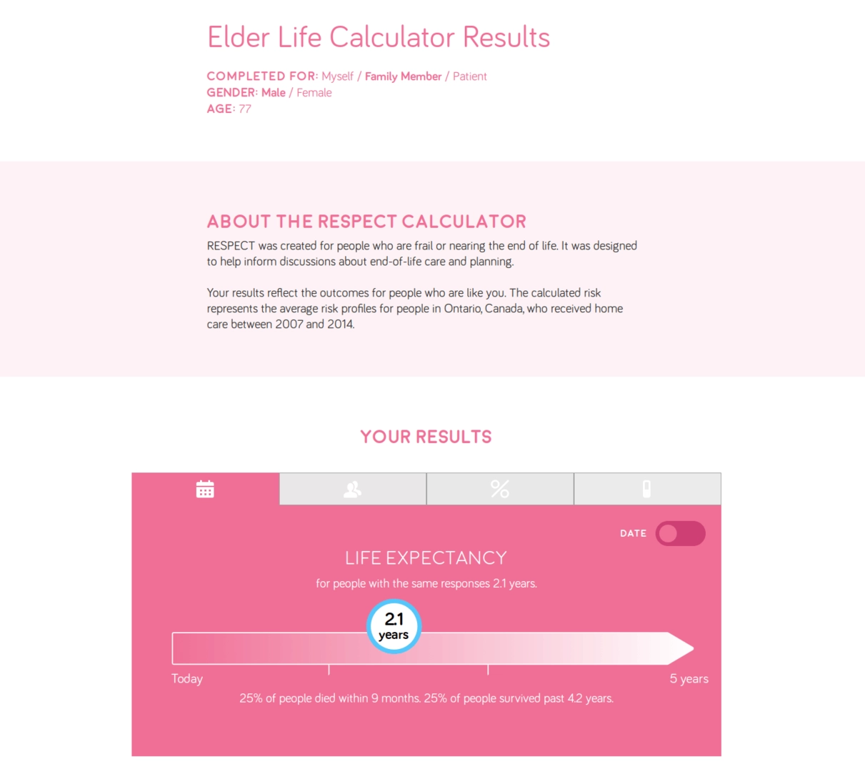 Причиной создания такого калькулятора послужило то, что в Канаде по статистике лишь 20% пожилых людей получают должный уход в последний год своей жизни. Большинство же стариков и вовсе умирают по непредсказуемым причинам. Благодаря такому устройству врачи и родственники смогут лучше понять, в чем нуждается человек.