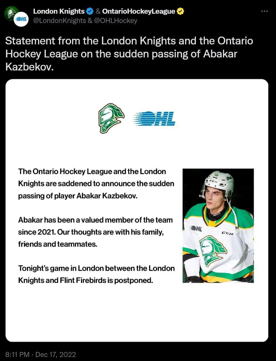 Хоккейная лига Онтарио и команда London Knights сообщили о смерти 18-летнего российского хоккеиста Абакара Казбекова.