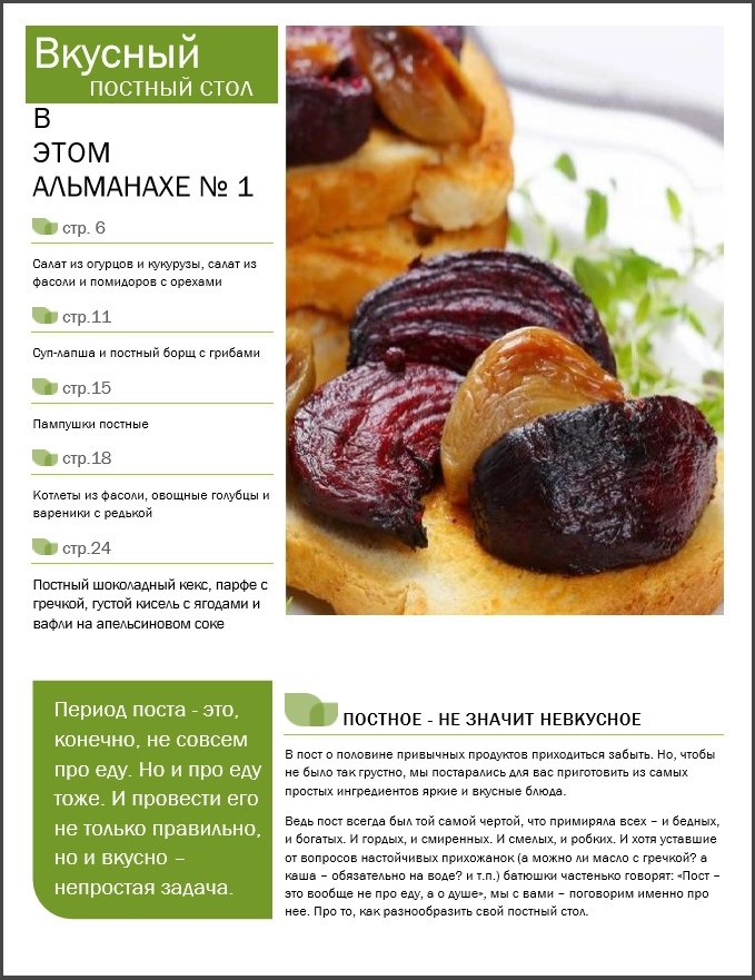 В качестве welcome-drink школа дарит своим потенциальным клиентам альманах № 1 «Вкусная постная кухня». Это 30 страниц весьма полезного текста и иллюстраций. В этих альманахах будет не просто собрание рецептов, а полное и подробное руководство к действию, проработанное до мельчайших деталей. Тут отражены и теоретические аспекты, и правильный выбор продуктов, и технологические нюансы, ну и, конечно, история блюд и истории о рецептах.