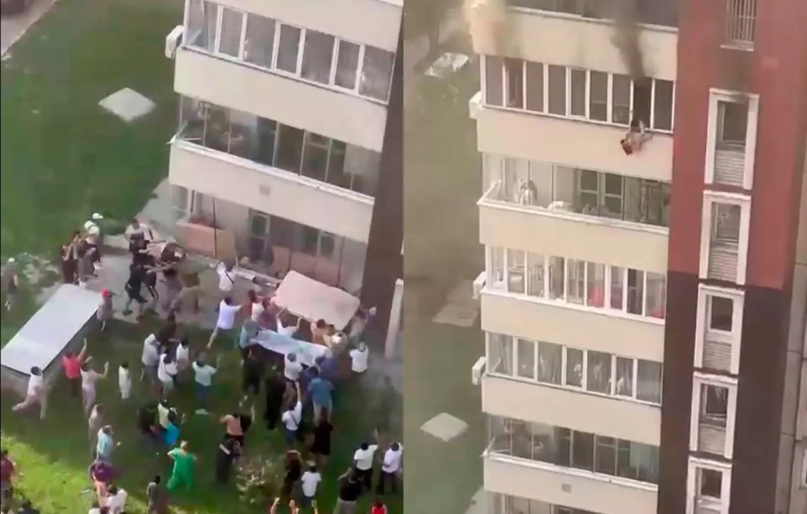 В Сети появилось видео, на котором несколько человек спасаются от огня, спрыгивая на растянутые внизу матрасы и ковры.
