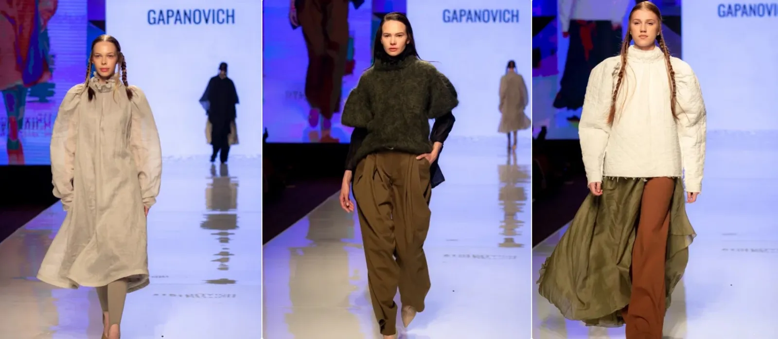 Дизайнер Александра Кручук из Мурманска для коллекций бренда Gapanovich переосмысливает традиционный русский народный костюм, связанный с историей народов Севера. Она использует рюши, ручную вязку, объемные рукава и юбки. В представленную коллекцию вошли изделия из вареного хлопка, крапивы, а также женственные блузы с цветочным принтом, летящие юбки и сарафаны из батиста и фатина.