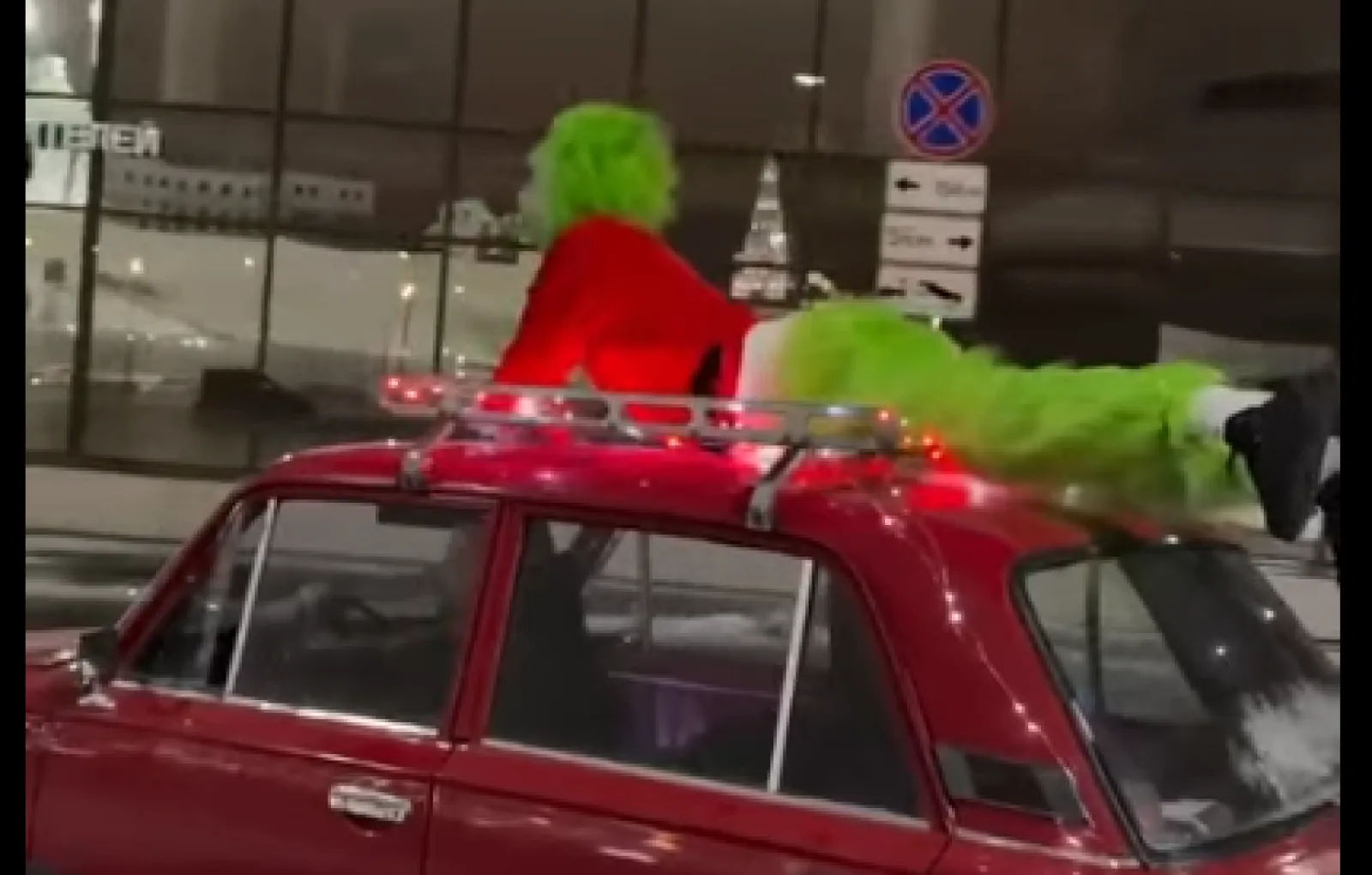 Видео с участием человека в костюме Гринча распространилось по социальным сетям и продемонстрировало его путешествие на крыше автомобиля с видами на Казанский Кремль и Центральный стадион.