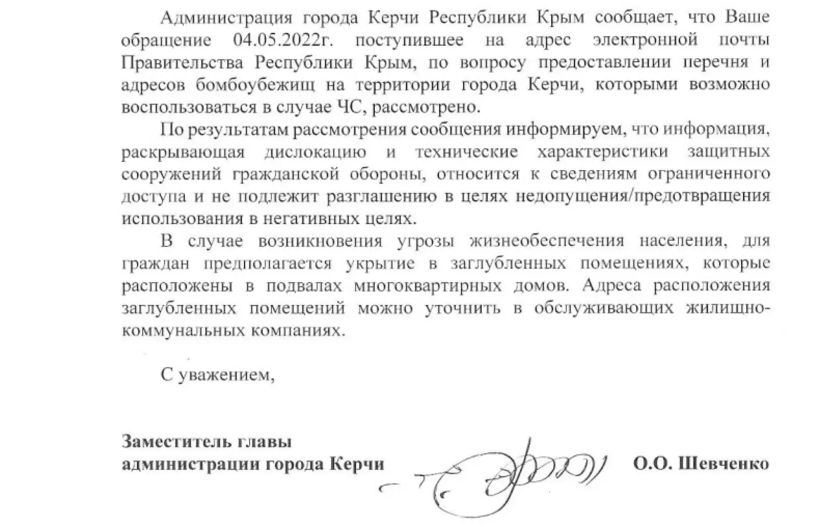 «Сайт Kerch.com.ru направил в администрацию Керчи запрос с целью проинформировать население о расположении бомбоубежищ. Однако, мы получили отказ, мотивированный раскрытием государственной тайны», — говорится в сообщении.
