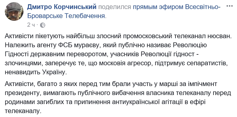 «Активисты пикетируют наиболее злостный промосковский телеканал ньюсван. Принадлежит агенту ФСБ Мураеву, который публично называет Революцию Достоинства государственным переворотом, участников революции — преступниками, отрицает то, что Московия агрессор, поддерживает сепаратистов, ненавидит Украину», — написал Корчинский на своей странице в Facebook.
