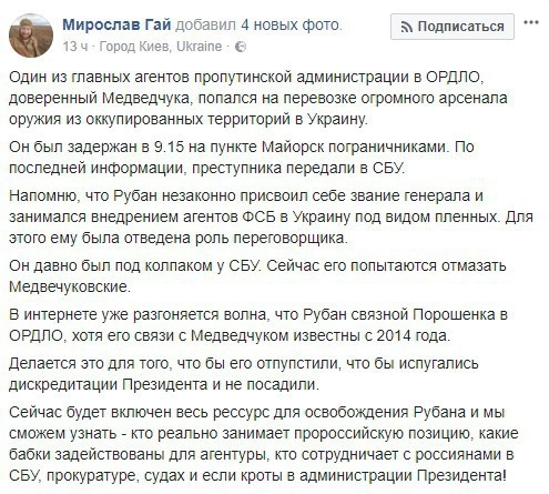 «Один из главных агентов пропутинской администрации в ОРДЛО, доверенный Медведчука, попался на перевозке огромного арсенала оружия из оккупированных территорий в Украину», — написал на своей странице в Facebook заместитель председателя Совета резервистов младший лейтенант Мирослав Гай.