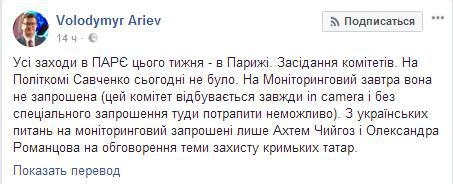 «Все мероприятия в ПАСЕ на этой неделе — в Париже. Заседания комитетов. На Политкоме Савченко сегодня не было. На мониторинговый завтра она не приглашена (этот комитет происходит всегда in camera и без специального приглашения туда попасть невозможно). Из украинских вопросов на мониторинговый приглашены только Ахтем Чийгоз и Александра Романцова, на обсуждение темы защиты крымских татар», — написал он в Facebook.