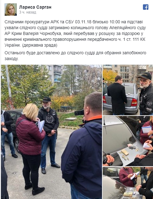 Следователями прокуратуры АРК и СБУ 03.11.18 около 10:00 на основании постановления следственного судьи задержан бывший глава Апелляционного суда АР Крым Валерий Чернобук, который находился в розыске по подозрению в совершении уголовного преступления предусмотренного ч. 1 ст. 111 УК Украины. (Государственная измена), — написала Сарган.