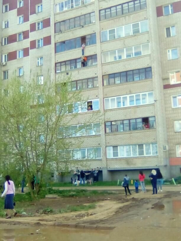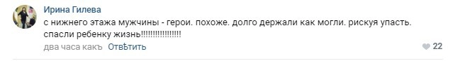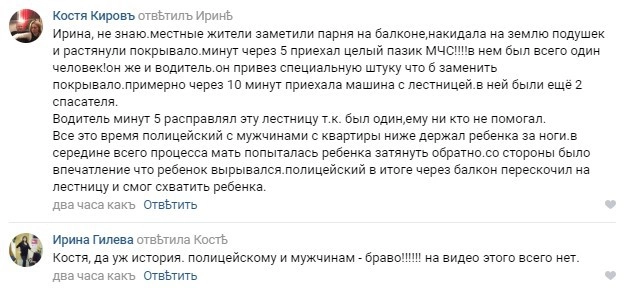 «Мальчика спасли, мама дома была. Что случилось, не знаем. Живем по соседству. Очень долго висел. Но слава богу пожарные приехали, лестницу подставили и сняли мальчишку», «Мама рядом была, они на 6 этаже были, а с 5 этажа мужчины и полицейские держали его за ножки. Чтоб ему легче держатся было. Зрелище конечно не для слабонервных», — написали пользователи.