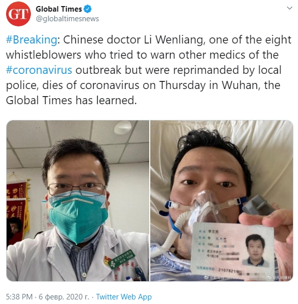В Китае умер врач, который одним из первых предупредил о коронавирусе