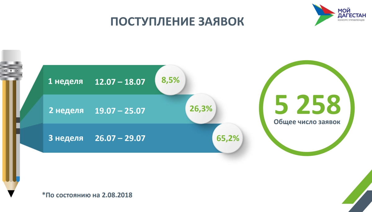 Правительство Республики Дагестан отчиталось о промежуточных итогах подготовительного этапа конкурса управленцев «Мой Дагестан». За шесть дней до проведения конкурса зарегистрировано 5258 заявок — это почти в пять раз выше, чем на первом республиканском кадровом конкурсе, прошедшем весной 2018 года.