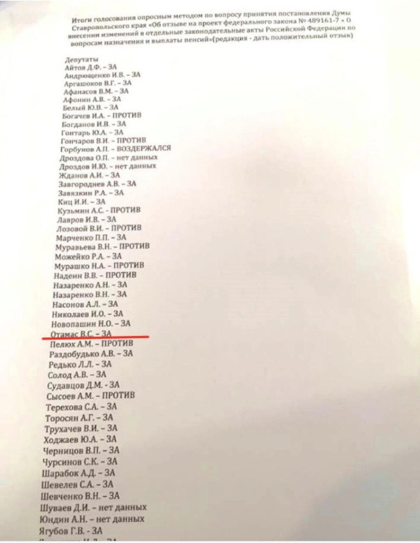 В Ставропольском крае в пользу изменения пенсионного законодательства высказался Виктор Отамас, являющийся членом КПРФ и состоящий в комитете по соцполитике и здравоохранению.