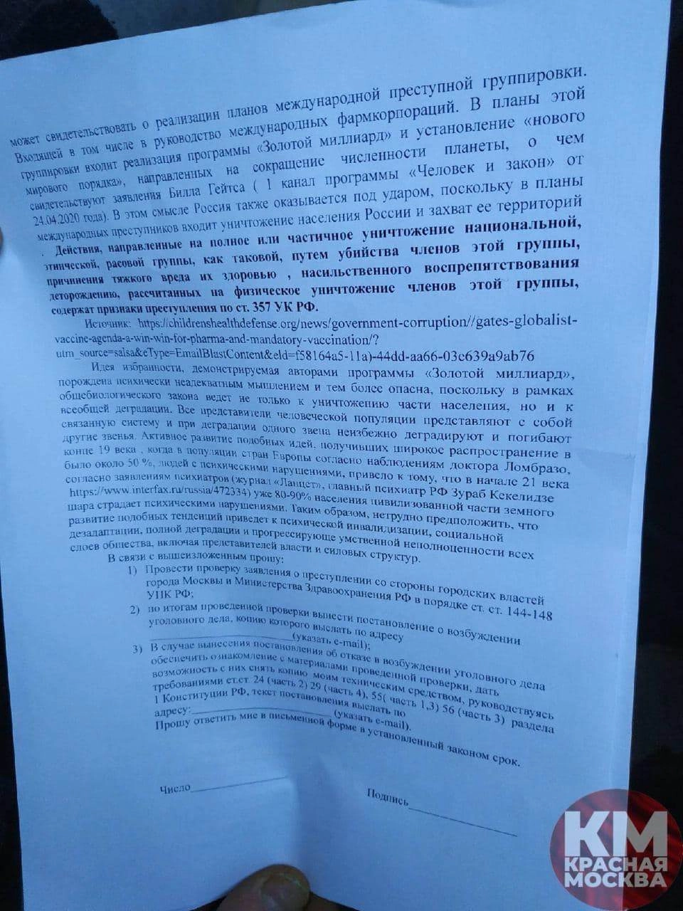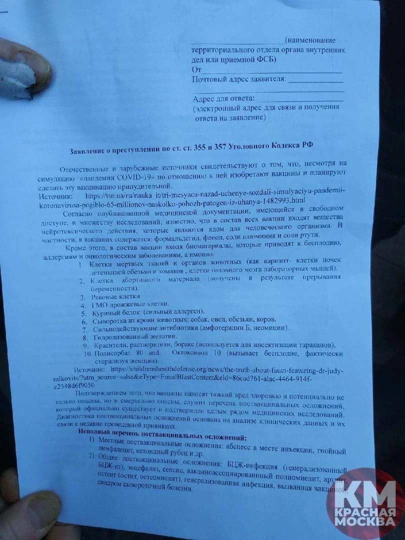 В тексте листовок, оформленных как заявление в ФСБ, утверждалось, что пандемия коронавируса — «симуляция», а подлинная цель прививок — сокращение численности населения, так как компоненты вакцин вызывают бесплодие.