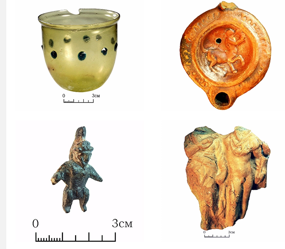 Археологи обнаружили и артефакты римского времени, например терракотовые статуэтки, бронзовые украшения, керамический масляный светильник с изображением кентавра, ударяющего в бубен.