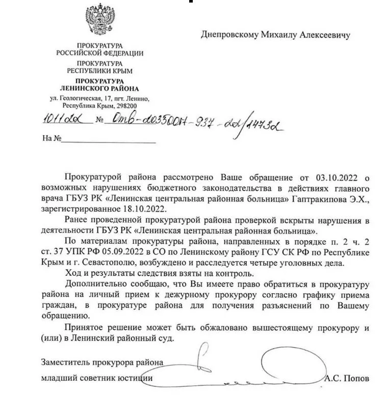 Прокуратура Ленинского района Крыма возбудила и расследует четыре уголовных дела в отношении отстранённого от должности главврача ГБУЗ РК «Ленинская центральная районная больница». Об этом стало известно из ответов надзорного ведомства на обращения автора этих строк.