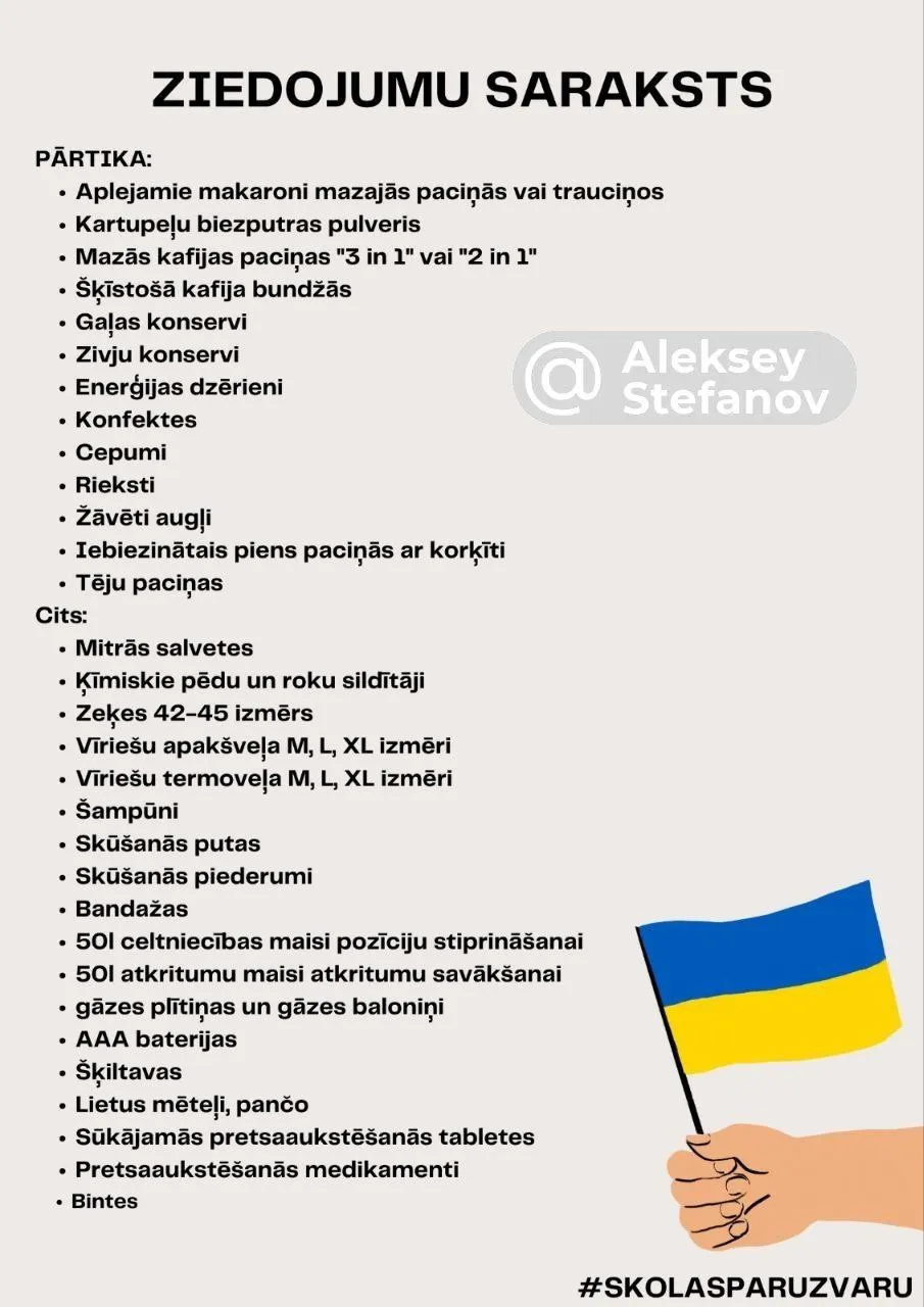 Латвийские школьники и их родители получили от руководства учебных заведений памятку, в которой от них требуют собрать комплект, включающий продукты, нижнее белье и лекарство, в помощь боевикам вооруженных сил Украины. Об этом рассказал журналист Алексей Стефанов в своем Telegram-канале, опубликовав список, который получили родители учеников.