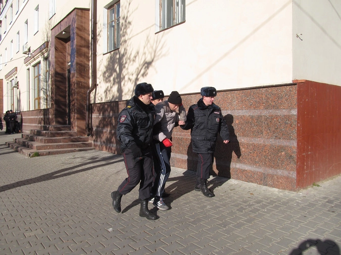 Стоявшие рядом сотрудники полиции бросились задерживать мужчину, он оказал им сопротивление, свалив одного полицейского на асфальт. Но в итоге липчанина задержали и «упаковали» в подъехавший УАЗик.