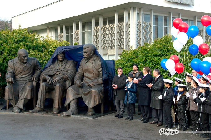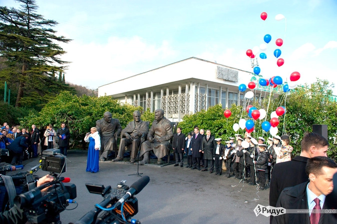«Посадили» лидеров держав, правда, не в том месте, где был сделан исторический снимок. Фотосессия проходила в итальянском дворике Ливадийского дворца, который слишком мал для творения скульптора, да и исторический облик решили не портить. Черчилль, Рузвельт и Сталин «уселись» возле санатория «Ливадия».