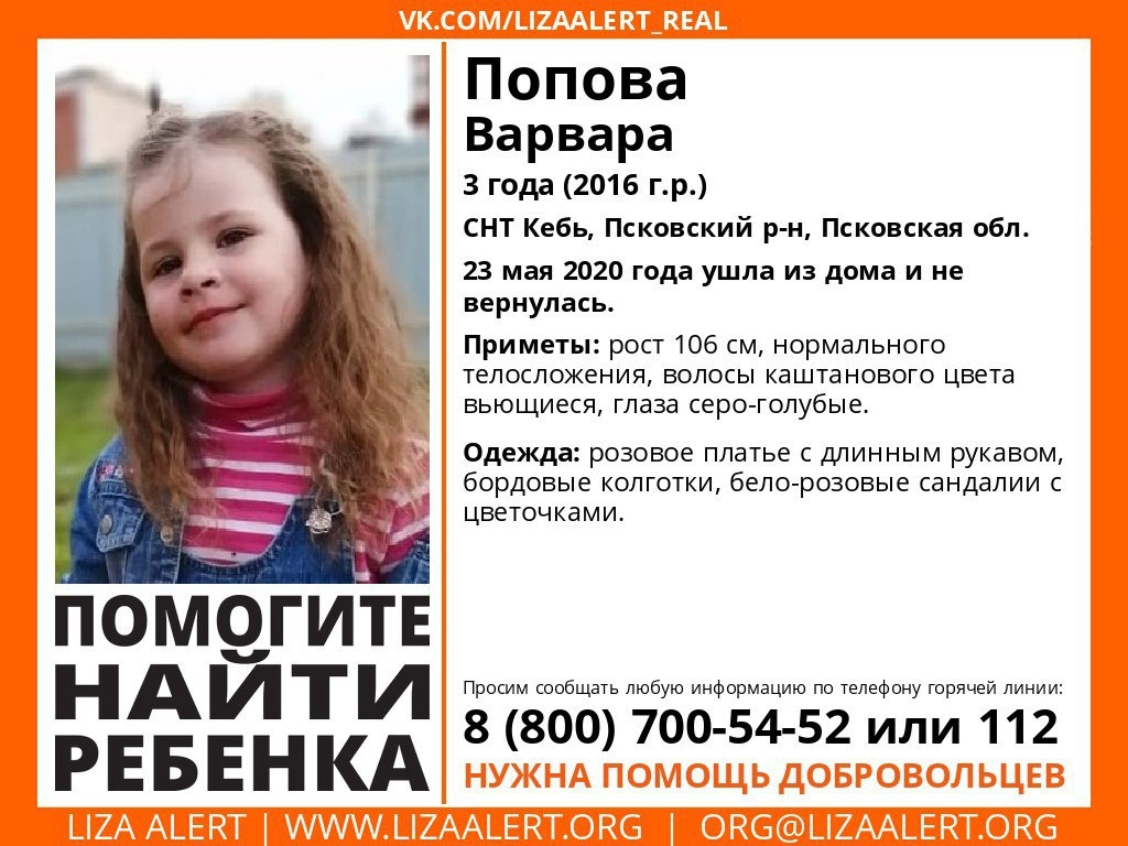Речь идет о поиске пропавшей в Псковской области трехлетней девочки Вари, которая не найдена до сих пор.