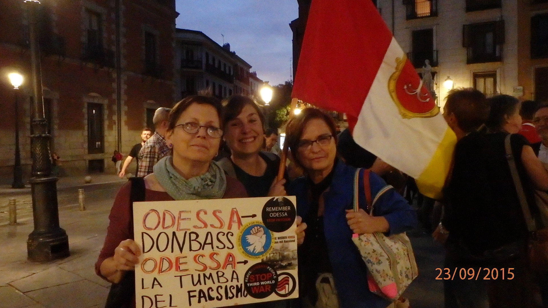 Единственный флаг, развевающийся над манифестантами рядом с плакатом «Одесса -Донбасс станут могилой фашизма» был флаг Одессы. Это неутомимые одесситы в очередной раз напоминают, что виновные в сожжении 48 человек в Доме профсоюзов даже не находятся под следствием, а выжившие в пожаре люди томятся в застенках Украинских тюрем.