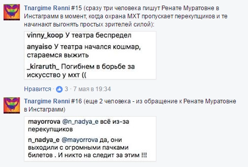 Автор самого распространенного поста в Facebook по этому поводу подчеркивает, что в комментариях и в личной переписке к нему обратилось множество людей, подтверждающих его слова. Все собранные свидетельства он намерен передать руководству МХТ им. Чехова.