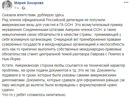 Это возмутительный пример неуважения Соединенными Штатами Америки членов ООН, а также невыполнения своих обязательств в качестве страны, принимающей у себя всемирную организацию, — написала официальный представитель российского МИД Мария Захарова в Facebook.