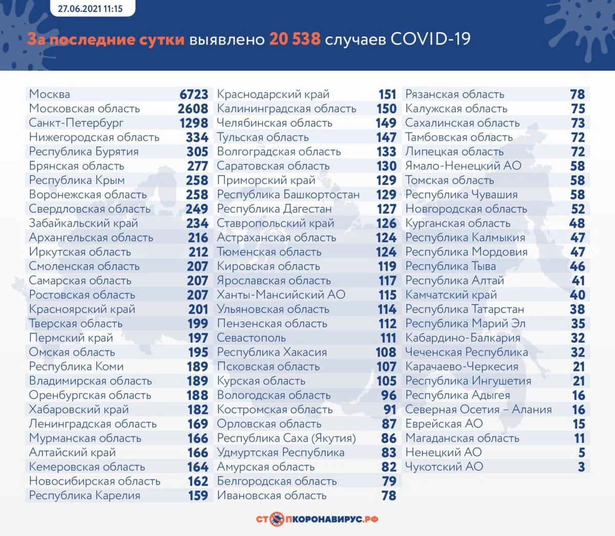 За последние сутки в России выявлено 20 538 случаев заражения коронавирусной инфекцией (днем ранее — 21 665), сообщил в воскресенье оперштаб. Зафиксировано 599 летальных исходов (днем ранее — 619).