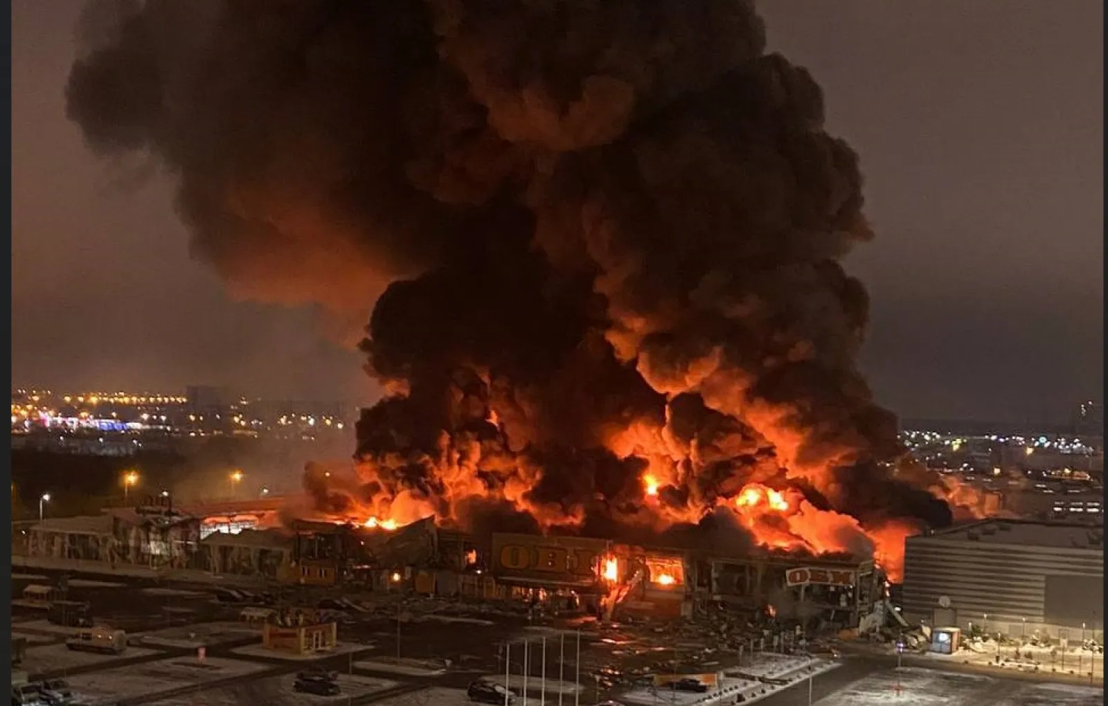 Очевидцы сообщают, что пожар начался с места, где расположен строительный магазин «Оби». На видео, запечатлевшее начало пожара, отчетливо слышны взрывы.