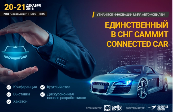 Саммит Connected Car Summit — событие, организованное ивент-компанией Smile-Expo совместно с НП «ГЛОНАСС», посвященное подключенным автомобилям, будет одновременно и деловым, и зрелищным. В ходе мероприятия эксперты обсудят вопросы бизнеса и законодательства, а любители новых технологий увидят умные авто, которые вот-вот появятся на российских улицах.