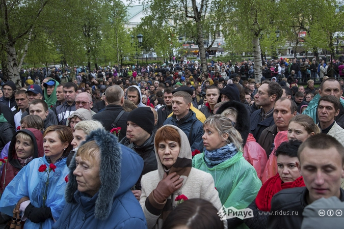 У участников акции в руках были флаги в виде больших георгиевских ленточек, российские флаги с траурными лентами, а также плакаты со словами соболезнования и скорби.