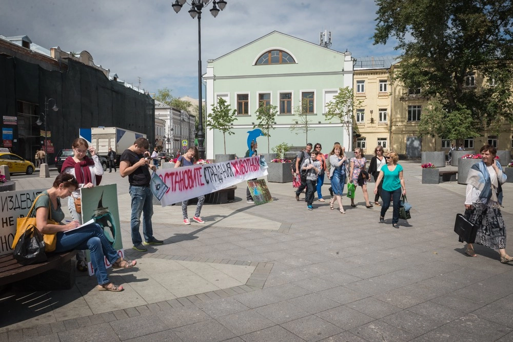 В субботу, 18 июля, активисты Альянса Защитников Животных вышли на пикет на площади у метро Новокузнецкая, обращаясь к москвичам с просьбой не ходить в дельфинарии, чтобы не поддерживать их существование. Активисты также пообщались с прохожими, раздавали им листовки со всей информацией и собирали подписи под обращением к Марату Рашидову, прокурору межрайонной природоохранной прокуратуры города Москвы с требованием закрыть дельфинарий в Измайловском парке. За час пикета было собрано почти сто подписей.
