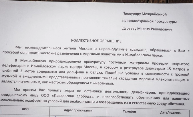 С тех пор, как в Москву привезли двух касаток с Дальнего Востока для океанариума на ВДНХ и открыли дельфинарий с дельфинами и белухой посреди Измайловского парка, зоозащитники Москвы развернули массовую кампанию против популяризации таких заведений в городе, которую онлайн поддержали десятки тысяч москвичей. Активисты заявляют, что дельфины и киты — высокоразвитые животные, и их нельзя использовать как «игрушки» и для развлечения (из которого кто-то извлекает немалую прибыль), это неестественно и вредно для них.