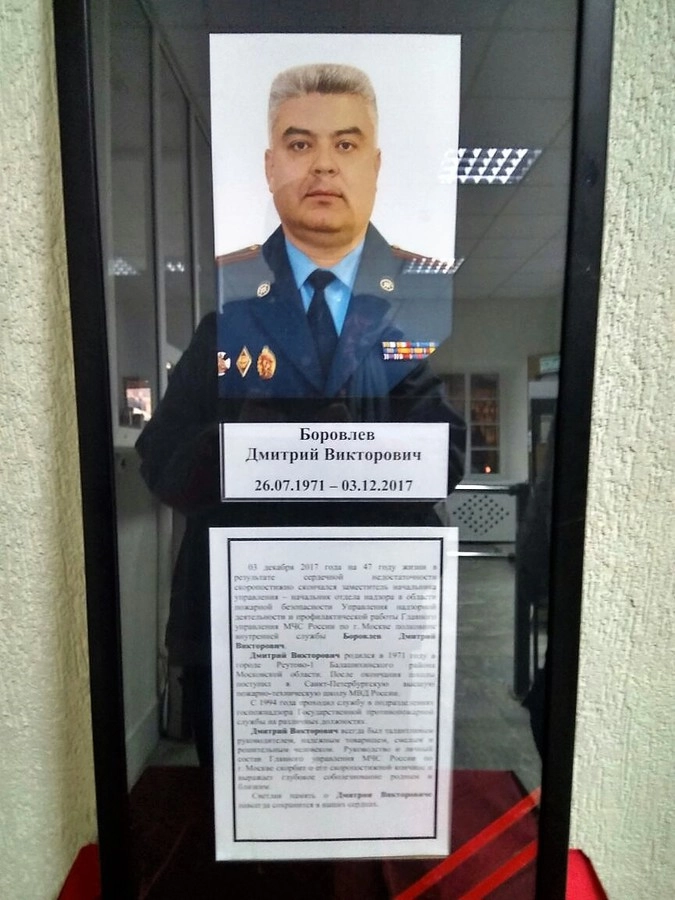 «03 декабря 2017 года, находясь дома, на 47 году жизни в результате сердечной недостаточности скоропостижно скончался заместитель начальника управления — начальник отдела надзора в области пожарной безопасности Управления надзорной деятельности и профилактической работы Главного управления МЧС России по г. Москве полковник внутренней службы Боровлев Дмитрий Викторович. С 1994 года проходил службу в подразделениях Государственной противопожарной службы на различных должностях. Руководство и личный состав Главного управления МЧС России по г. Москве скорбит о его скоропостижной кончине и выражает глубокое соболезнование родным и близким», — говорится в сообщении ГУ МЧС по Москве.