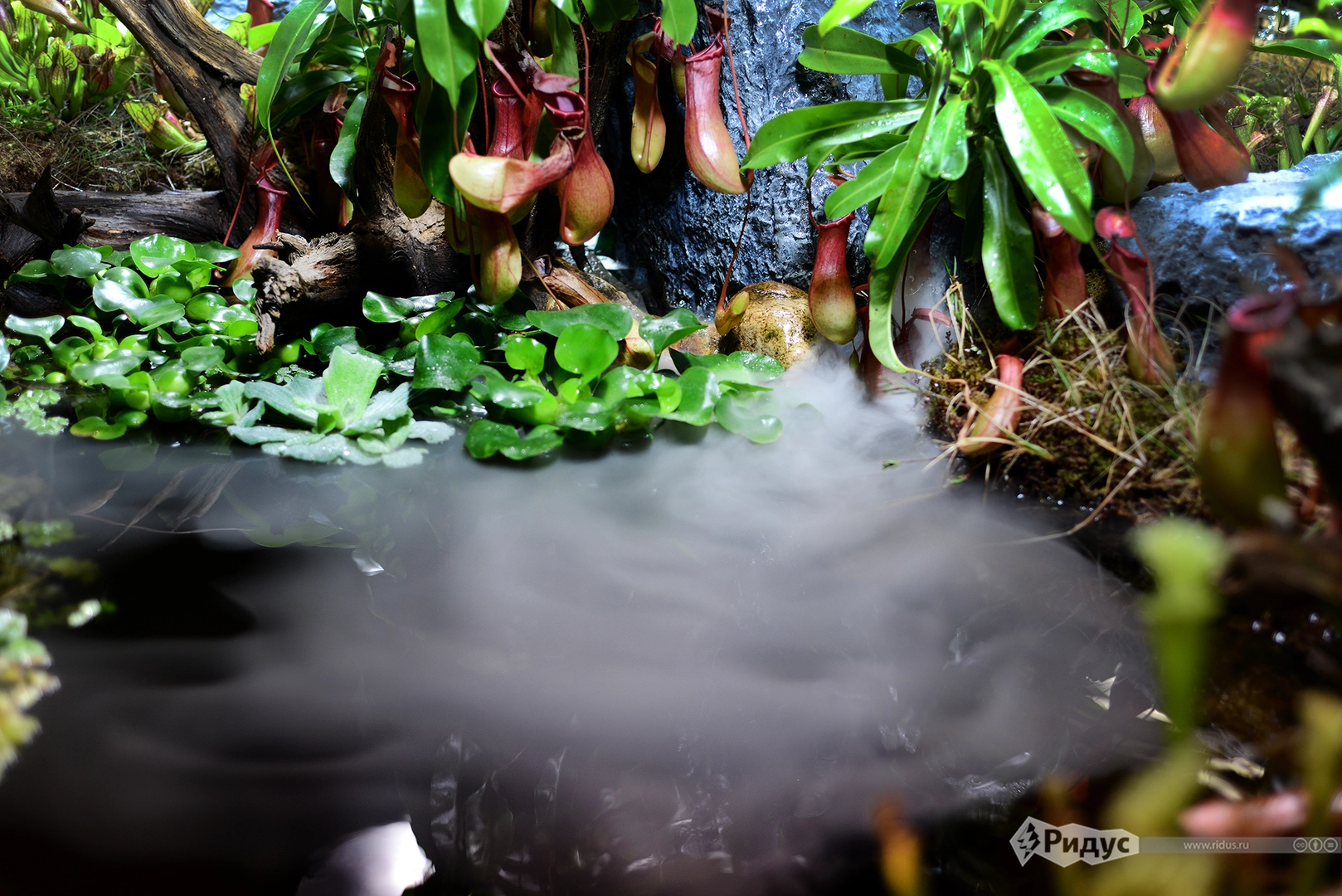 Фактически это кусок настоящего болота, перенесенный в оранжерею и населенный парой сотен плотоядных представителей флоры. Среди них различные виды росянок, жирянка, южноамериканская гелиамфора, цефалотус, непентес, он же кувшиночник. Кстати, не все они прибыли к нам из тропиков – плотоядные росянки встречаются и в Подмосковье.