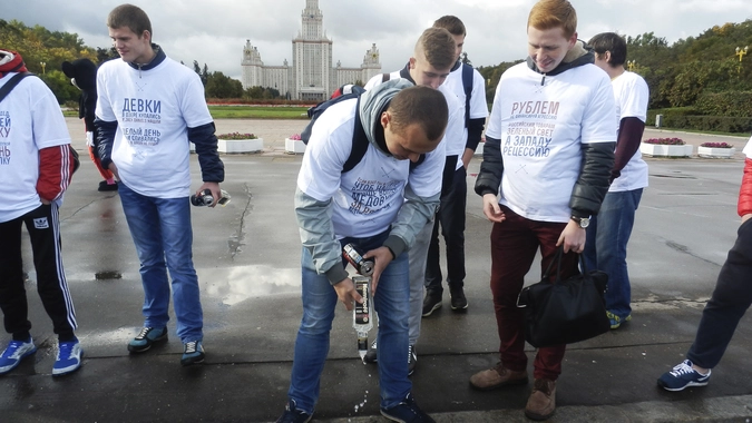 Около 30 человек провели сегодня акцию под лозунгом «Западному алкоголю и алкоэнергетикам нет места в магазинах РФ». В знак протеста против употребления западного алкоголя и вводимых санкций, они вылили в московскую канализацию более 20 литров элитных алкогольных напитков и популярных энергетических напитков — «вражеского пойла» на асфальт смотровой площадки Воробьевых гор.