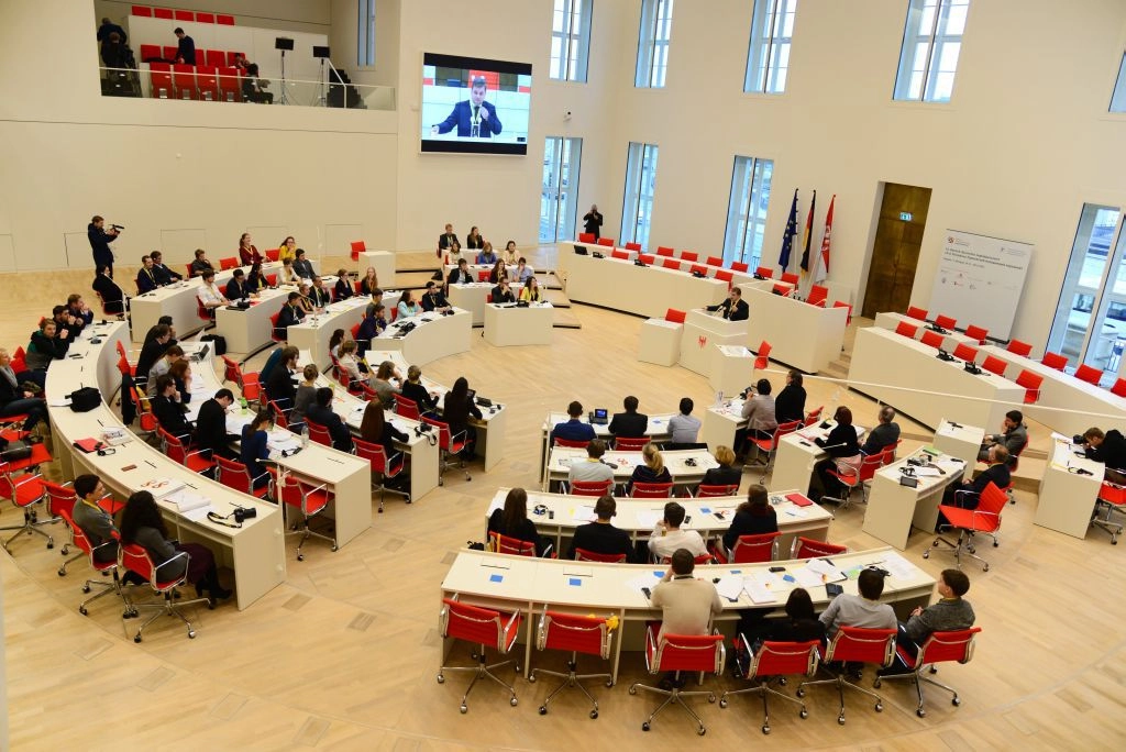 Работа парламента началась в здании Ландтага земли Бранденбург с официального открытия и выступления организаторов и почетных гостей. Первой слово взяла Бритта Штарк, президент Ландтага Бранденбурга. Она сравнила мир с «глобальной деревней» и отметила важность проведения таких международных встреч для укрепления дружбы и улучшения взаимопонимания. Затем перед собравшимися выступил директор фонда «Германо-российский молодёжный обмен», Томас Хоффман. Он подчеркнул, что никакие санкции и спекуляции в СМИ не смогут препятствовать молодёжному обмену и назвал эту встречу хорошим знаком в отношениях России и Германии.