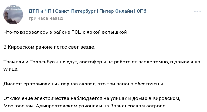 Как сообщают жители города в соцсетях, свет погас в Василеостровском, Кировском и Адмиралтейском районах. На улицах не работают светофоры и не ходят троллейбусы и трамваи.