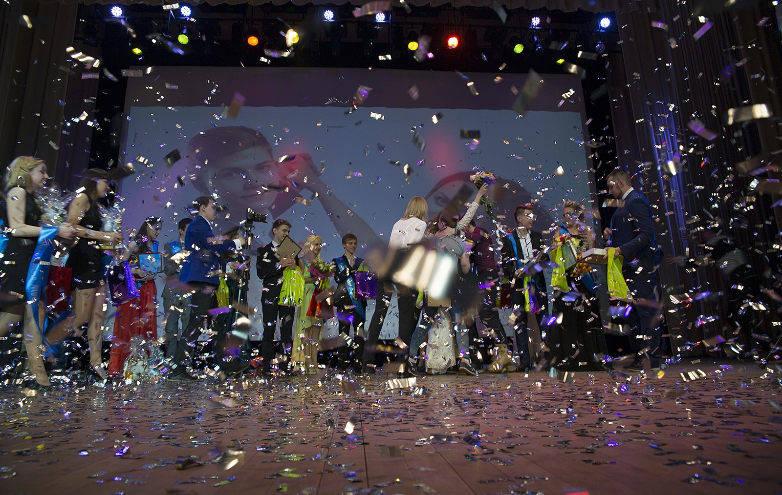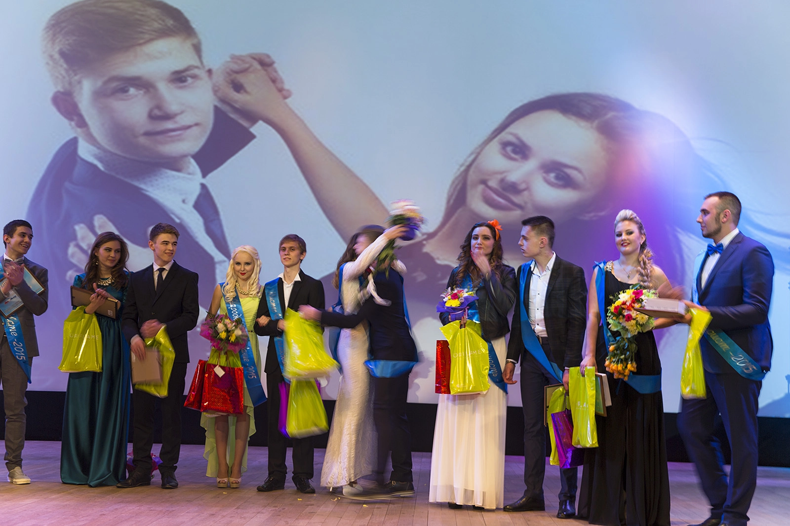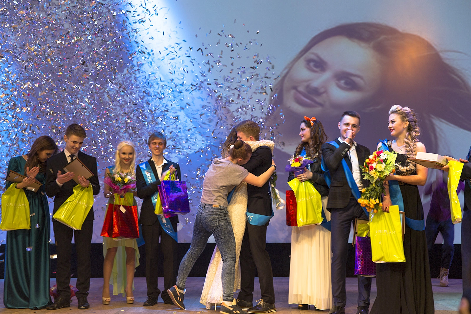 Первые секунды после объявления победителей. Не все проигравшие успели сделать добрые улыбки. А члены команды уже пытаются на радостях задушить победителей в своих объятьях, чтобы запомнились Мисс и Мистер "молодыми и красивыми".